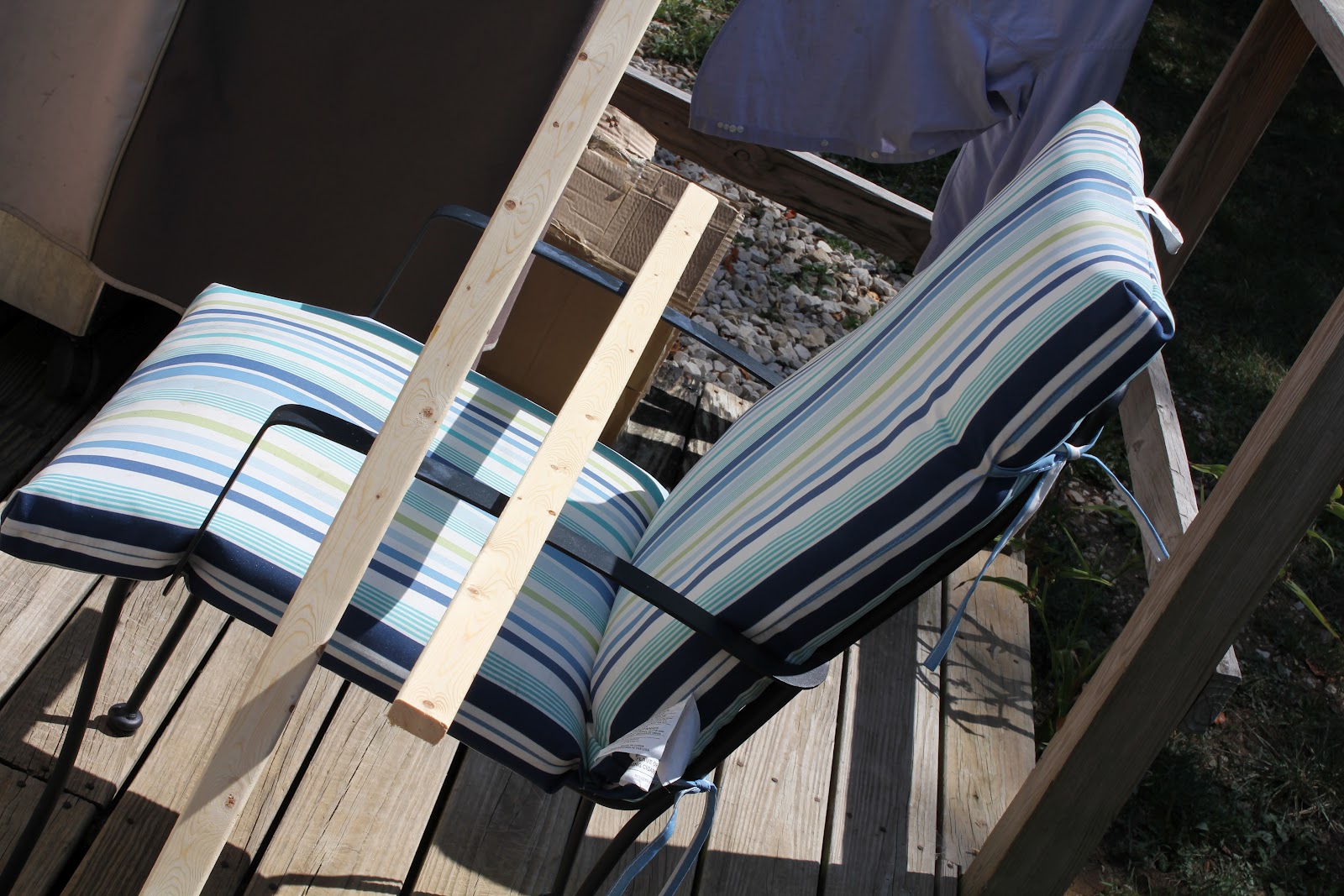 This is our "workbench"...aka, our lawn furniture with wood across it. Ed did the cutting (scary picture to follow) and I was the clamp. Side note: we bought a clamp today since I'm not the best clamp.